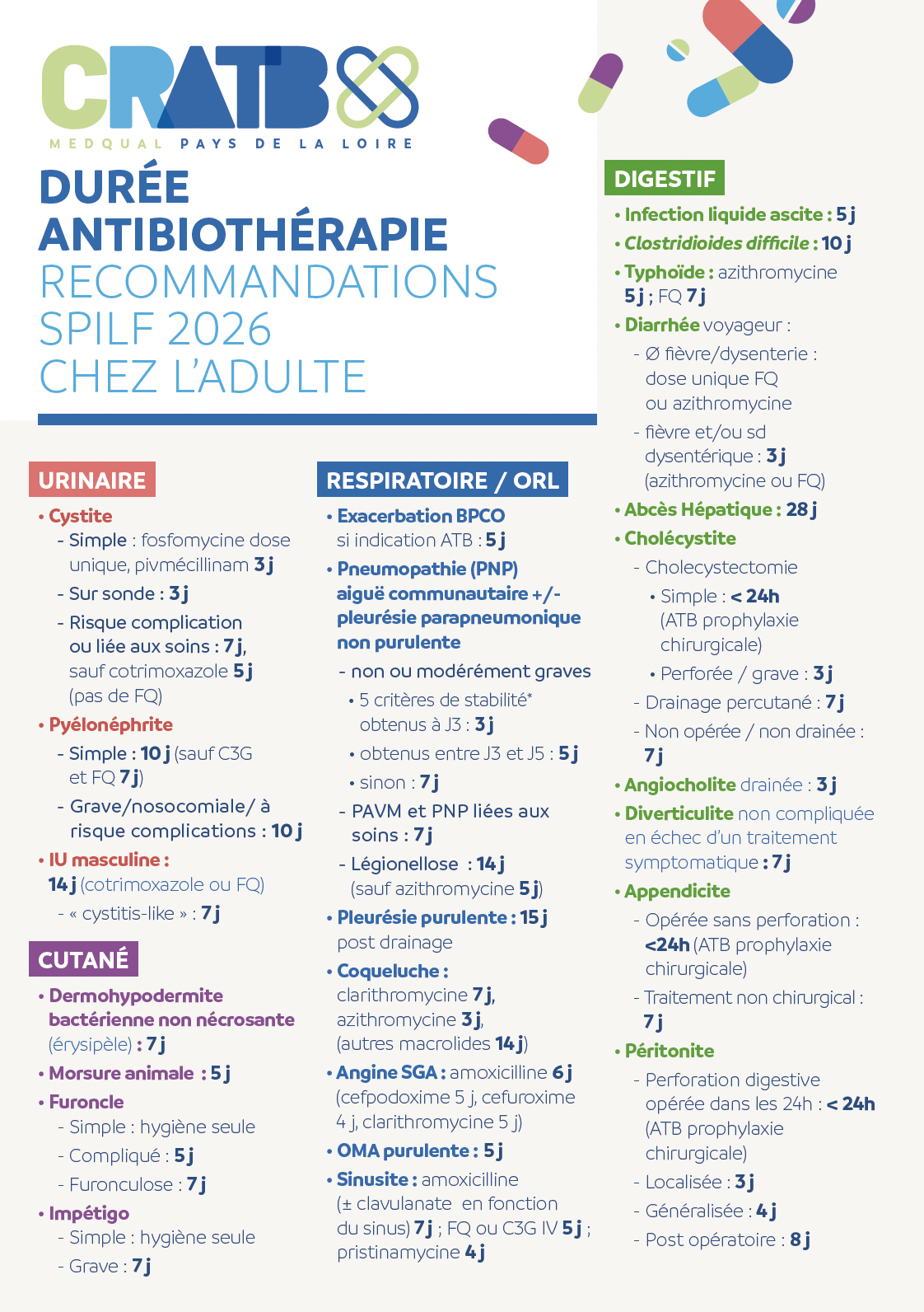 Durée antibiothérapie, recommandations spilf 2026 chez l’adulte (mémo)